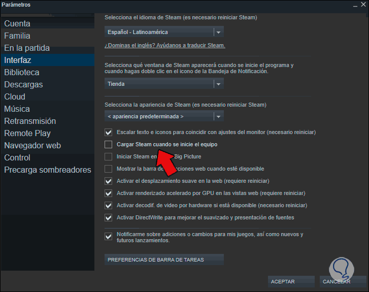 En la ventana desplegada, vamos a la sección Interfaz y allí validamos que la casilla "Cargar Steam cuando se inicie el equipo" esté desmarcada. Aplicamos los cambios.