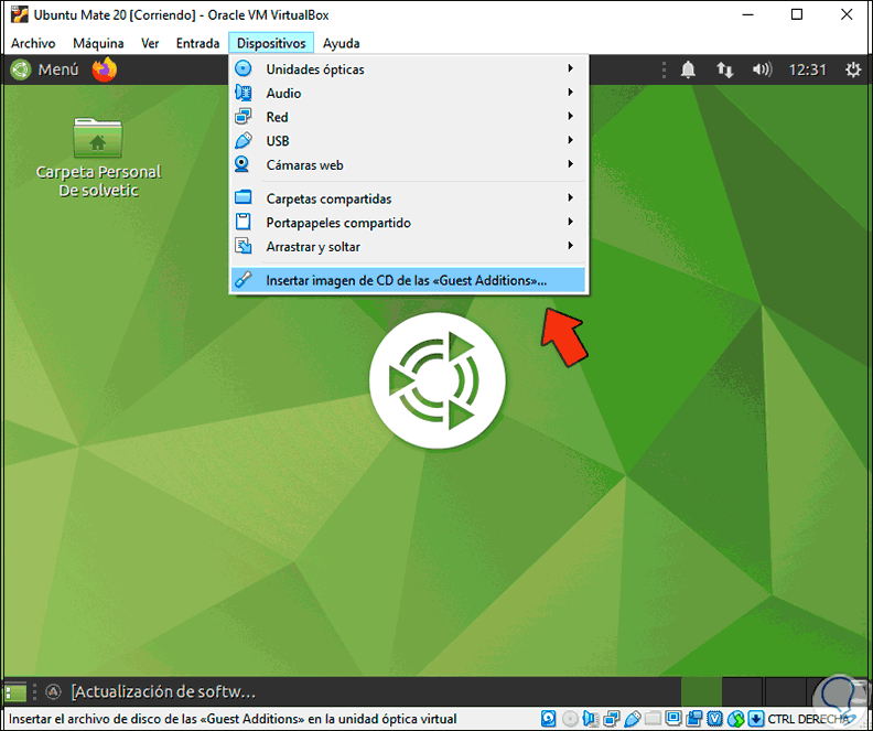 Ahora es momento de instalar las Guest Additions de VirtualBox, estas permiten una interacción más completa con el equipo y sistema real, para su instalación, vamos al menú "Dispositivos - Insertar imagen de CD de las Guest Additions":