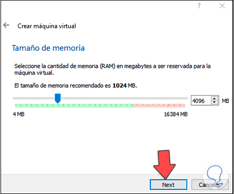 Después de esto asignamos la memoria RAM a usar en la máquina virtual: