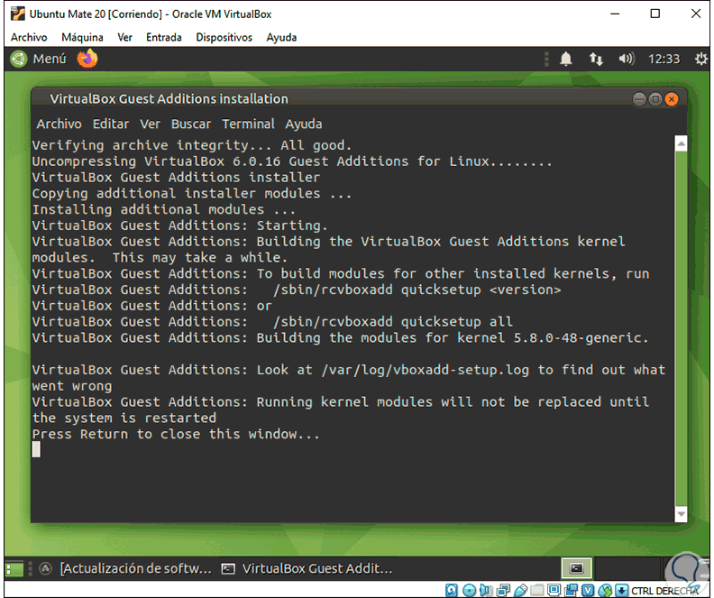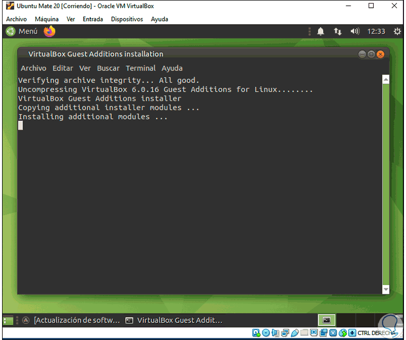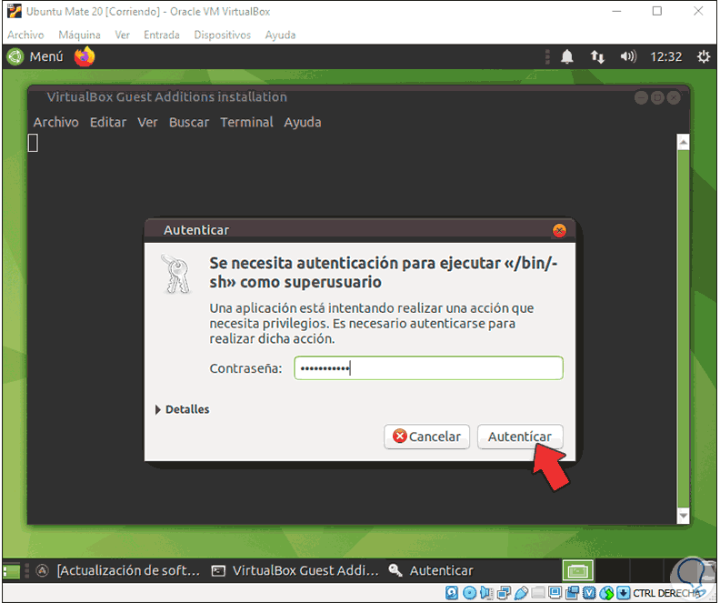 Damos clic en Autenticar para que se lance la terminal con la instalación de las Guest Additions: