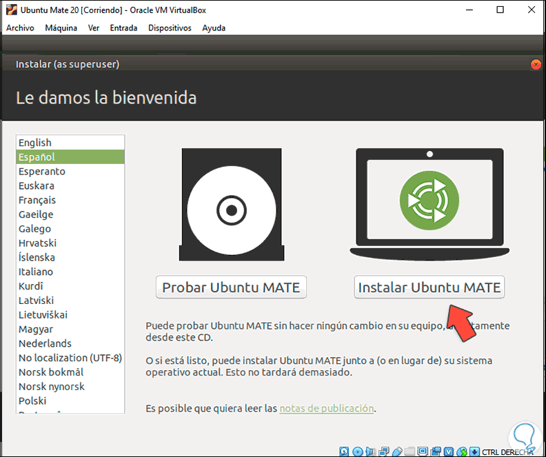 Cuando este proceso llegue a su fin veremos lo siguiente donde seleccionamos el idioma de instalación de Ubuntu MATE:
