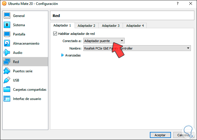 Accedemos a la configuración de la máquina y activamos el adaptador de red: