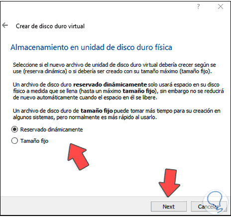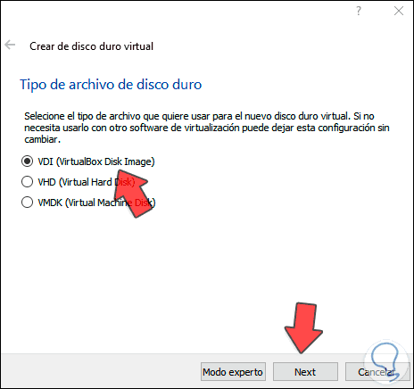 Damos clic en Crear y elegimos el tipo de disco duro: