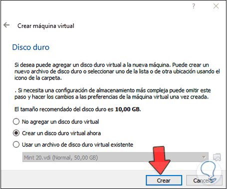 Posterior a ello seleccionamos la creación del disco duro virtual: