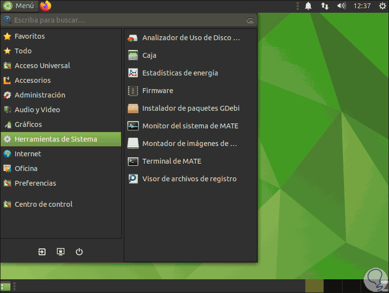 - Herramientas propias del entorno de escritorio como Caja, Calculadora, Captura de pantalla, Terminal, Estadísticas, etc