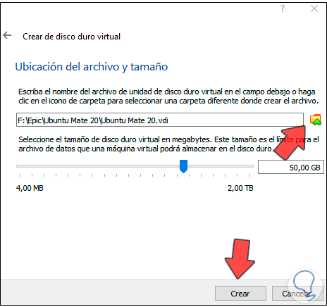 Clic en Next y asignamos el tamaño del disco, es posible cambiar su ubicación si así lo deseamos: