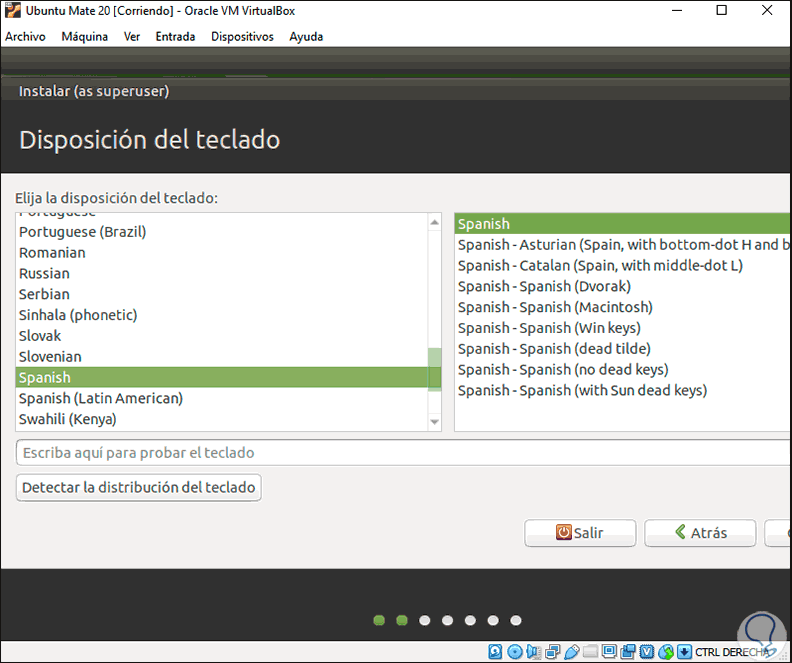 Damos clic en "Instalar Ubuntu MATE" y luego definimos el idioma del teclado: