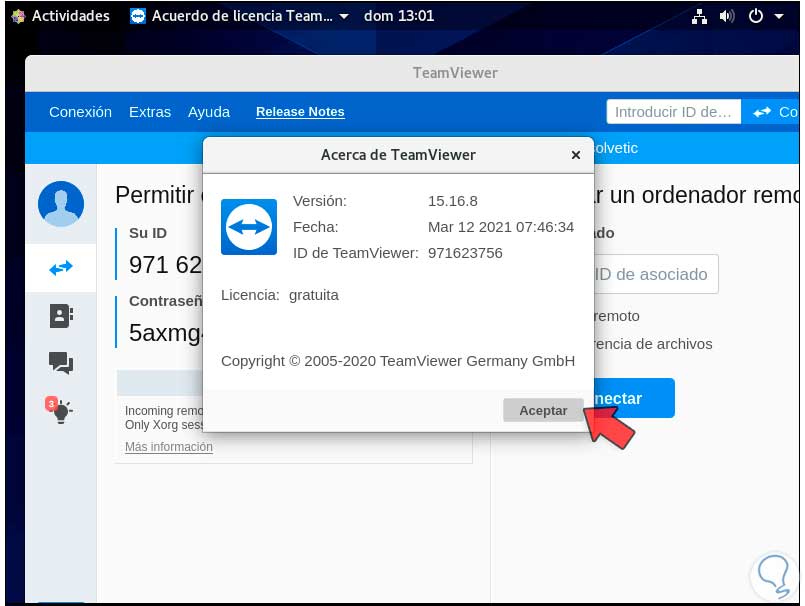 Luego abrimos de nuevo TeamViewer y debemos aceptar la licencia de uso: