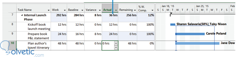 En caso que no asignemos fechas, Project 2013 asumirá que la tarea empezó a tiempo, sin embargo si colocamos una cantidad de horas mayor a las estimadas en el cronograma inicial entonces la línea del diagrama Gantt se va a extender mostrando horas adicionales de trabajo extra.