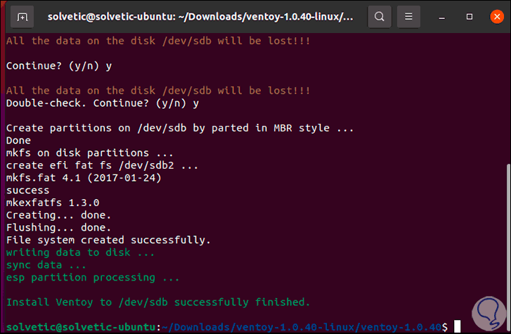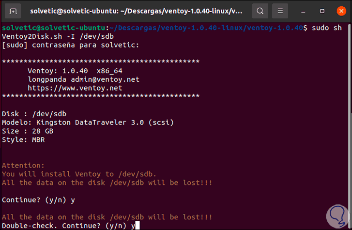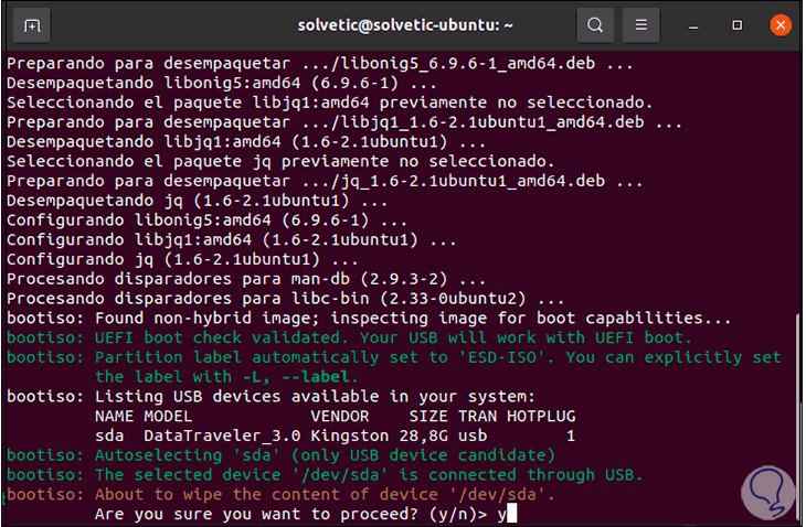 Allí debemos aplicar los cambios ingresando la letra y, esto es para borrar los datos de el USB, luego de esto veremos lo siguiente: