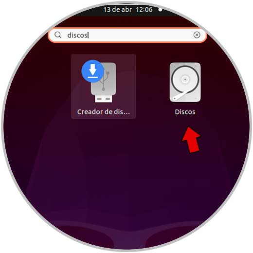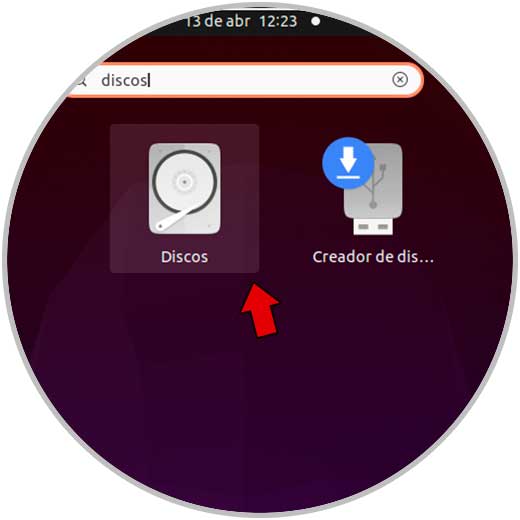 El siguiente paso es accede a la utilidad Discos desde el buscador de Linux: