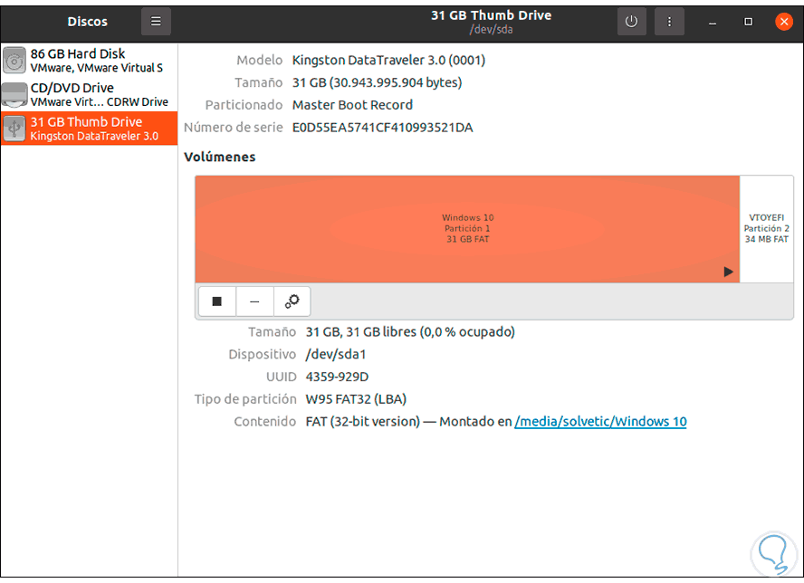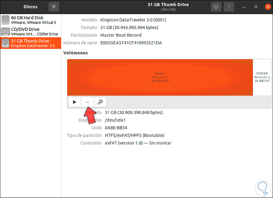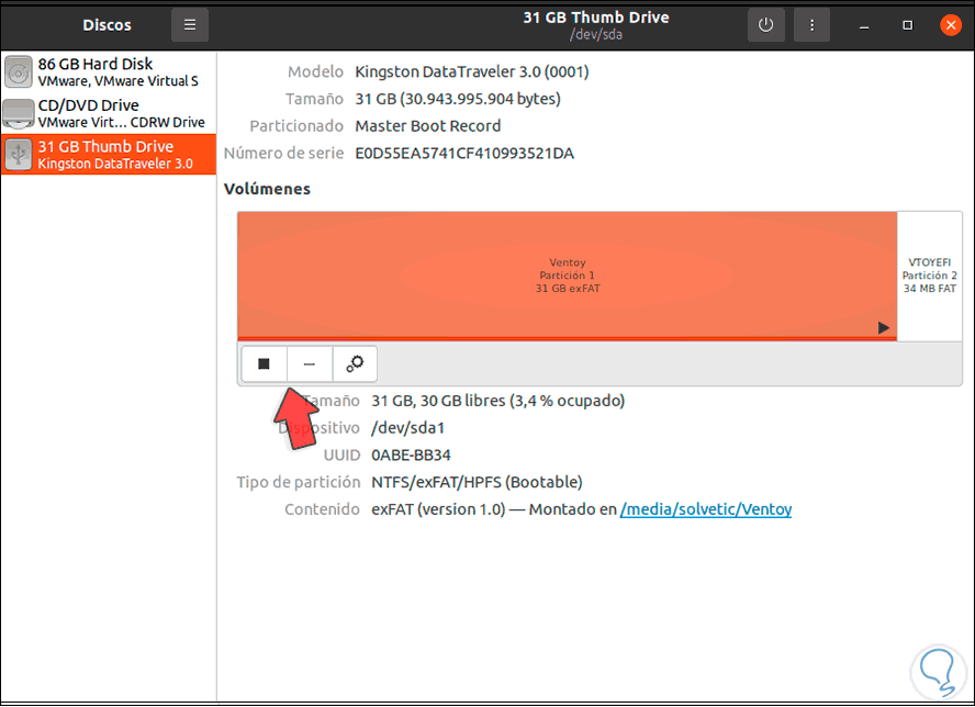 En la aplicación Discos seleccionamos el USB y pulsamos en el botón de detener para desmontarla: