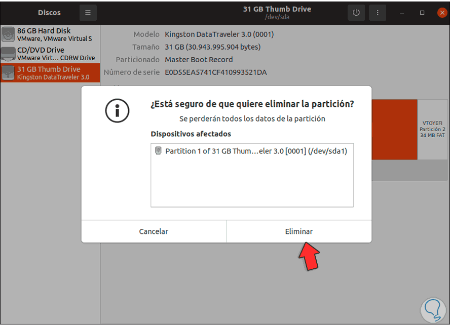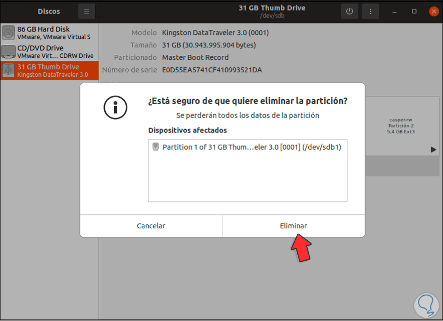 Da clic en el signo - para borrar las particiones de el USB, se desplegará el siguiente mensaje: