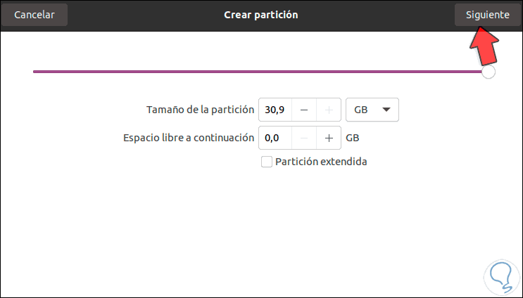 Damos clic en el signo + para crear una nueva partición y en primer lugar seleccionamos todo el espacio disponible: