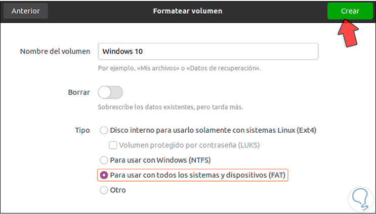 Damos clic en Siguiente para asignar el nombre y activamos la casilla "Para usar con todos los sistemas y dispositivos (FAT)":