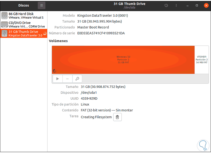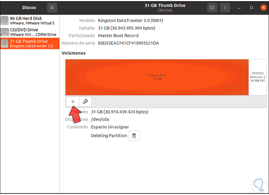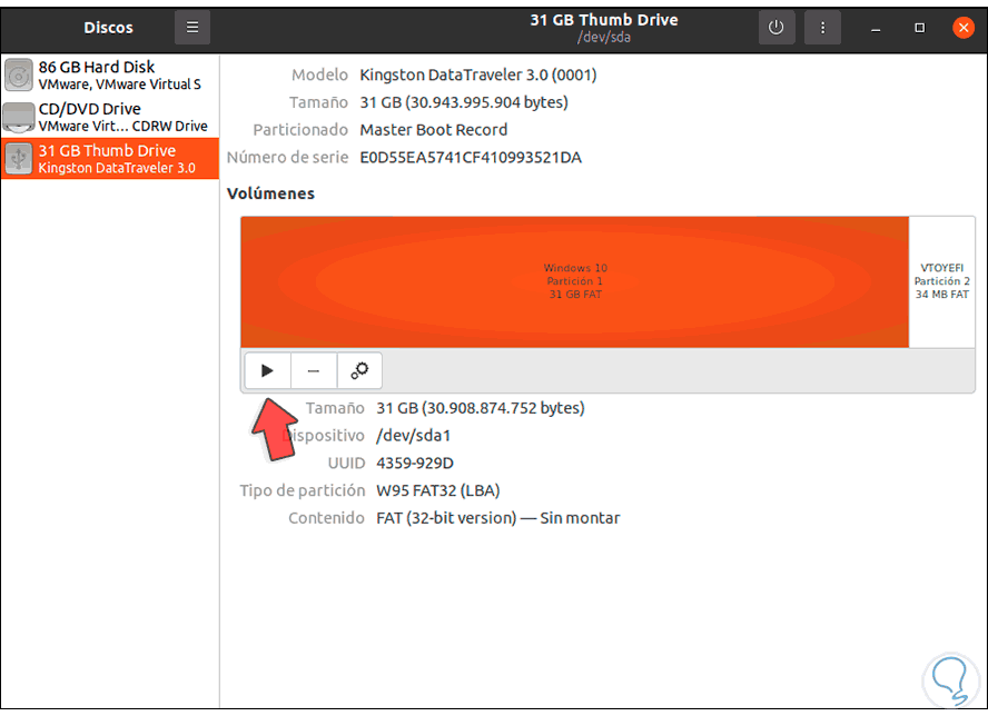 En la ventana de Discos seleccionamos el USB a donde se creará el arranque: