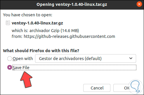 Damos de nuevo clic en el archivo de Linux tar.gz y guardamos el archivo localmente: