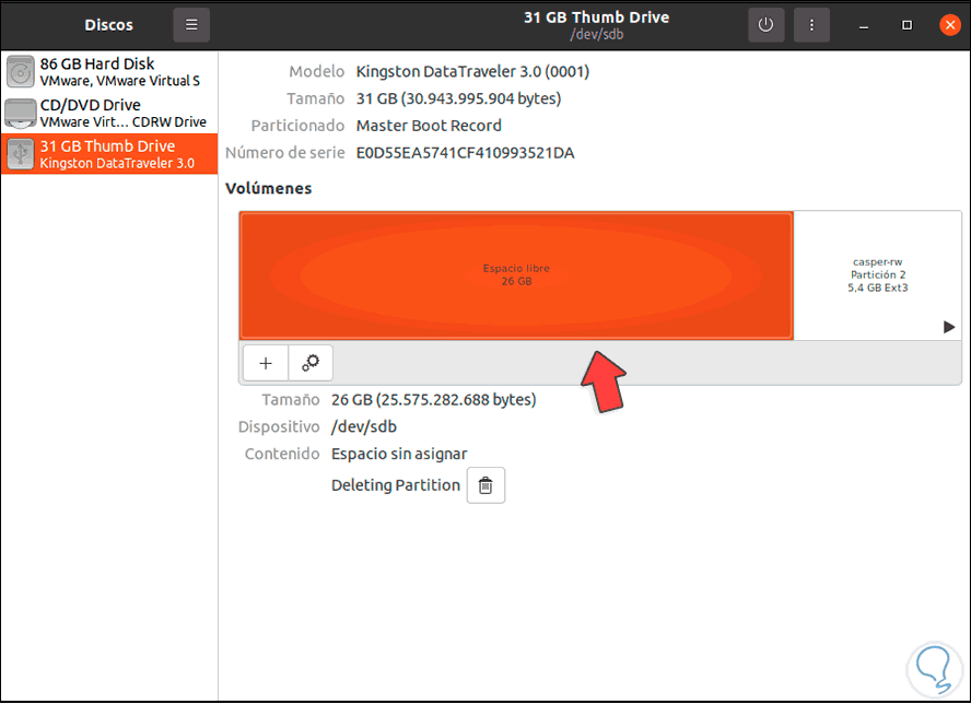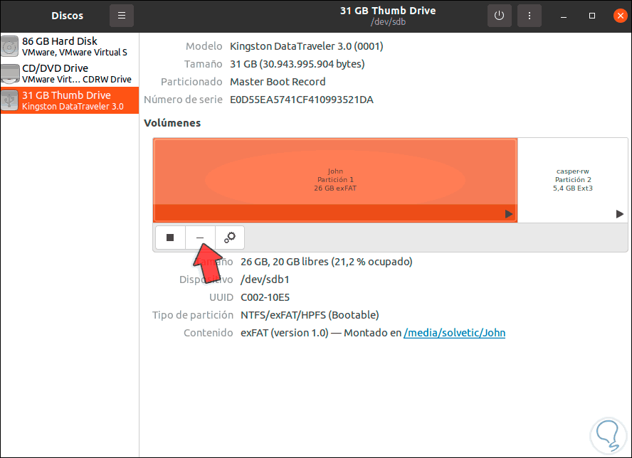 Ahora damos clic en el signo - para borrar las particiones actuales de el USB: