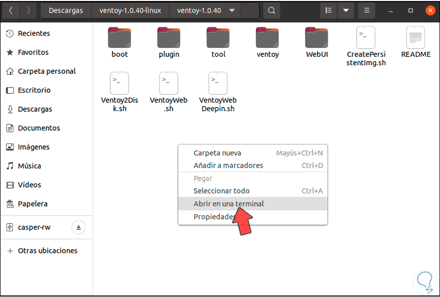 Damos clic derecho en la carpeta Ventoy y en las opciones desplegadas seleccionamos "Abrir en una terminal":