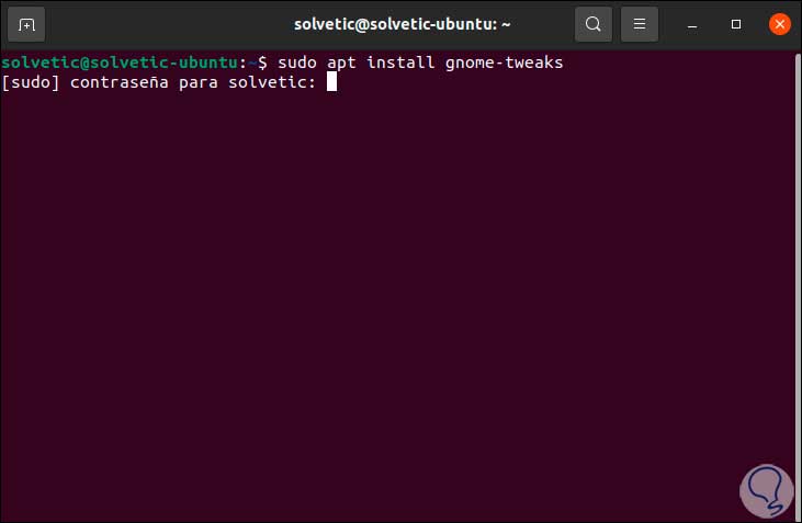 Para esto primero debemos instalar Gnome-Tweaks el cual es un aplicativo que permite realizar cambios generales en el aspecto de Ubuntu, para su instalación, abrimos la terminal y en ella ejecutamos "sudo apt install gnome-tweaks":