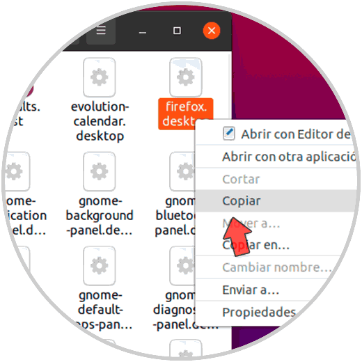Allí encontramos todas las aplicaciones de Ubuntu con la extensión .desktop, uno de los métodos para crear el acceso directo es dar clic derecho sobre la aplicación y seleccionar la opción Copiar: