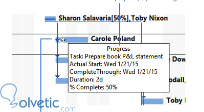 4- Vamos ahora a seleccionar otra tarea y repetimos el proceso, solo que ahora vamos a colocar el 50% de porcentaje de completado a la tarea, si colocamos el mouse sobre la barra de la tarea en el diagrama Gantt podremos ver ciertos detalles que nos darán una información más profunda de la misma: