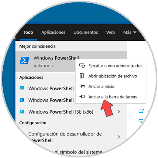 Esta es otra de las opciones disponibles y simple, en este caso en el buscador ingresamos "powershell", luego damos clic derecho y seleccionamos "Anclar a la barra de tareas":
