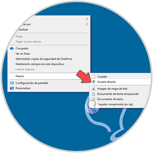 Para usar este método, damos clic derecho en el escritorio y allí seleccionamos "Nuevo - Acceso directo":
