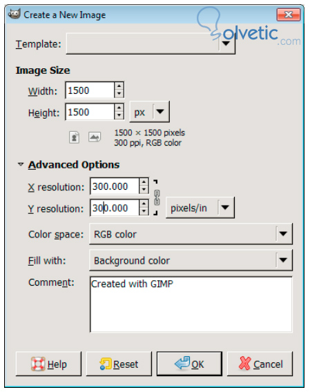 Abrimos Gimp y seleccionamos la opción nueva imagen, esto nos abrirá un cuadro con las opciones a configurar.