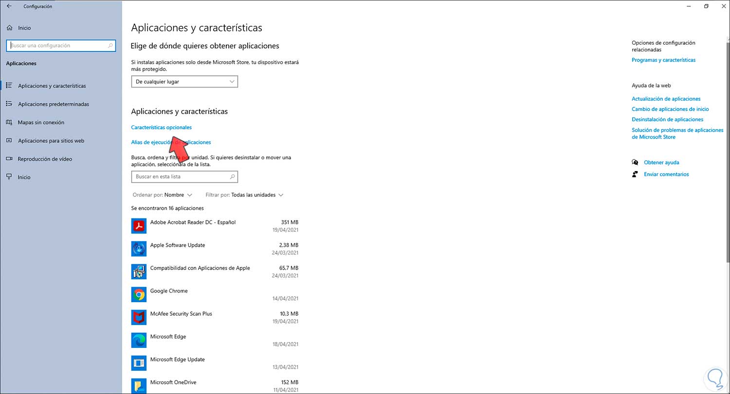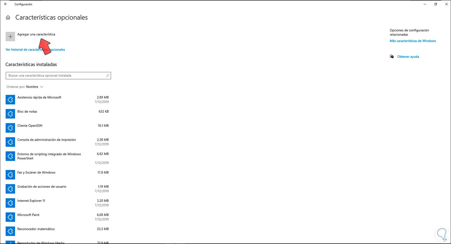 Damos clic en "Características opcionales" y será desplegado lo siguiente: