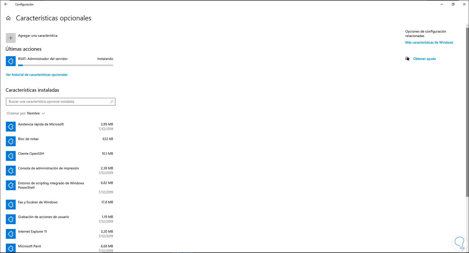 Ahora, para instalar RSAT en Windows 10, vamos al siguiente menú y, veremos lo siguiente: