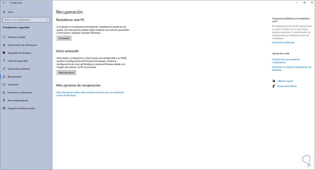 Para esto debemos acceder al modo de reinicio avanzado, para ello podemos ir al botón de apagado del sistema, pulsar la tecla Shift y luego dar clic en Reiniciar, o bien es posible ir a "Inicio - Configuración - Actualización y seguridad - Recuperación", veremos lo siguiente.