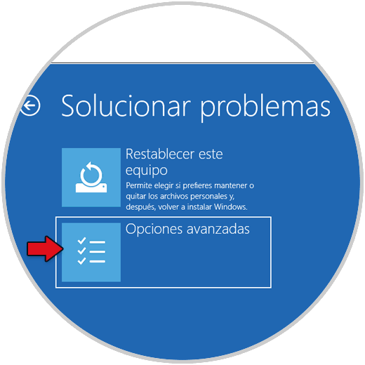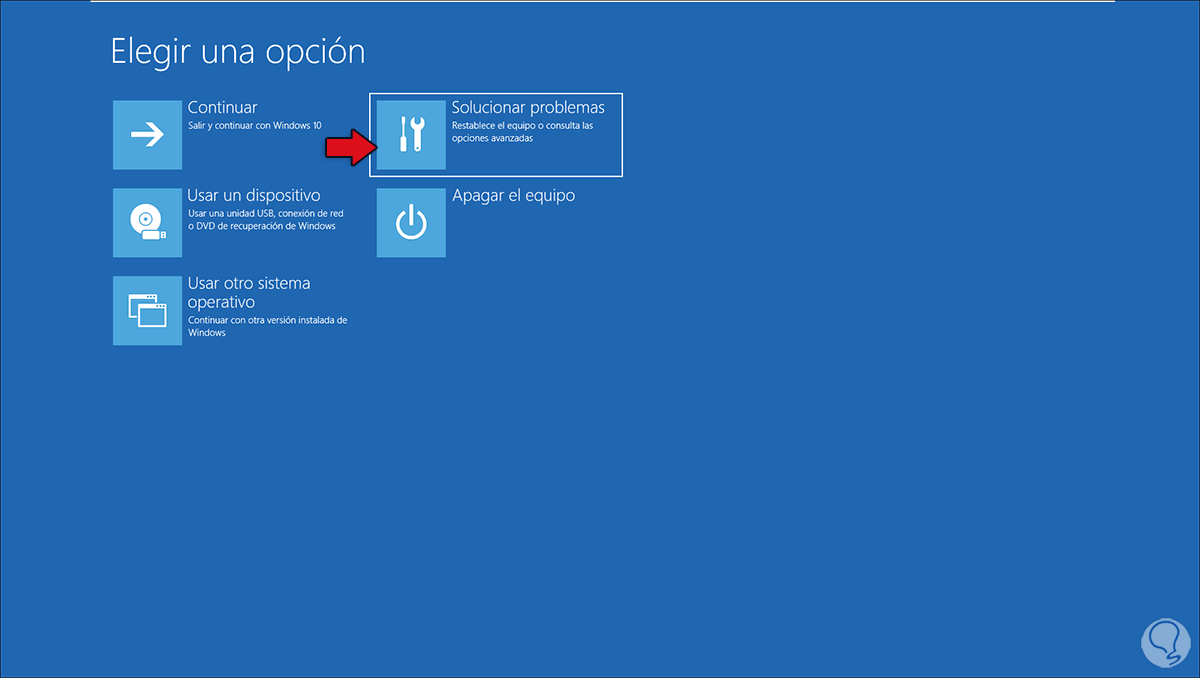 El sistema se reiniciará y luego veremos lo siguiente. Damos clic en "Solucionar problemas"