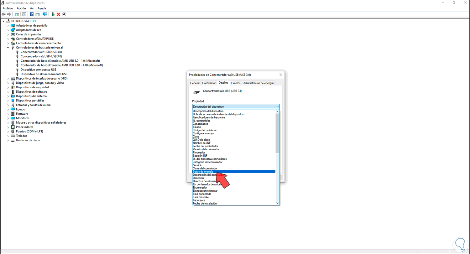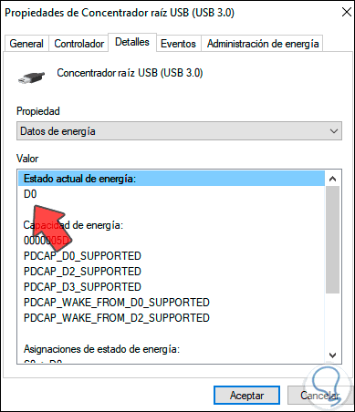 Allí verás el valor D el cual puede ser D0 a D3. Hay que tener en cuenta, cuanto mayor sea el número de la letra D, significa que menor será la potencia de los puertos USB en Windows 10. Este es el método para conocer estos detalles desde Administrador de dispositivos.