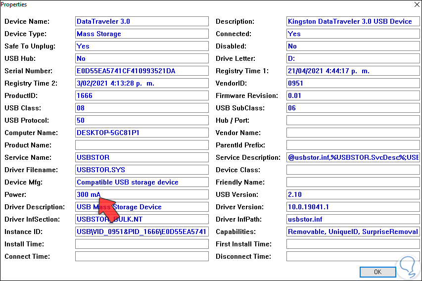 Seleccionamos el dispositivo USB deseado y será abierta una nueva ventana con todos los detalles de esta, en el campo "Power" veremos la energía usada por este: