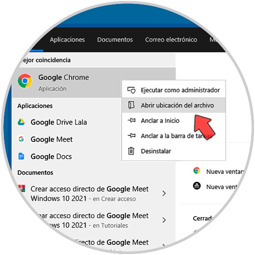 Para Google Chrome, en el buscador ingresamos Google, damos clic derecho sobre Google Chrome y seleccionamos "Abrir ubicación de archivo":