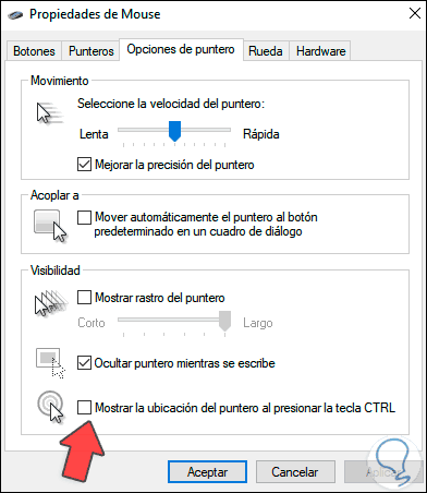 Activamos la casilla "Mostrar la ubicación del puntero al presionar la tecla CTRL". Aplica los cambios dando clic en Aplicar y luego en Aceptar.