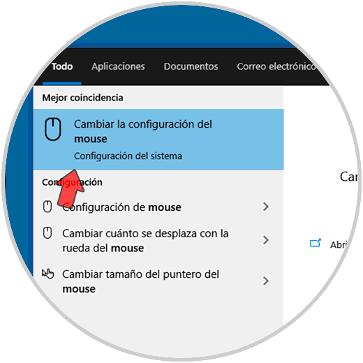 Para lograr esto, en el buscador de Inicio ingresamos "mouse", allí seleccionamos "Cambiar la configuración del mouse":