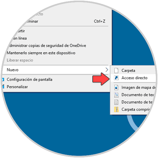 Damos clic derecho en el escritorio y seleccionamos "Nuevo - Acceso directo":