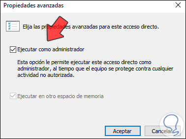 Damos clic en "Opciones avanzadas" y allí activamos la casilla "Ejecutar como administrador". Aplicamos los cambios.