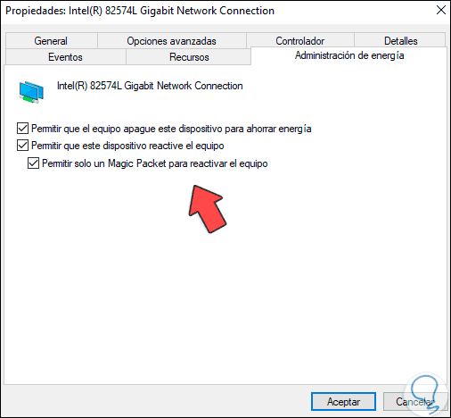 Validamos que todas las casillas estén activas ya que estas permiten la recepción del paquete mágico y el posterior funcionamiento de Wake on Lan.