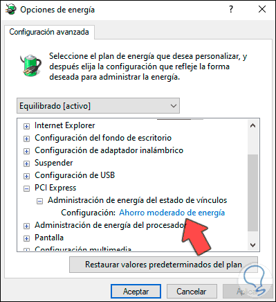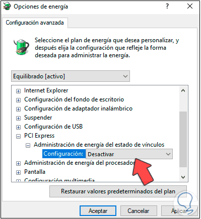 Allí damos clic en "Cambiar la configuración avanzada de energía" y en la ventana emergente en la sección PCI Express, seleccionamos "Administración de energía del procesador":