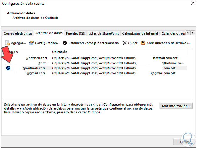 En la ventana desplegada vamos a la pestaña "Archivo de datos" y allí seleccionamos el correo a dejar por defecto: