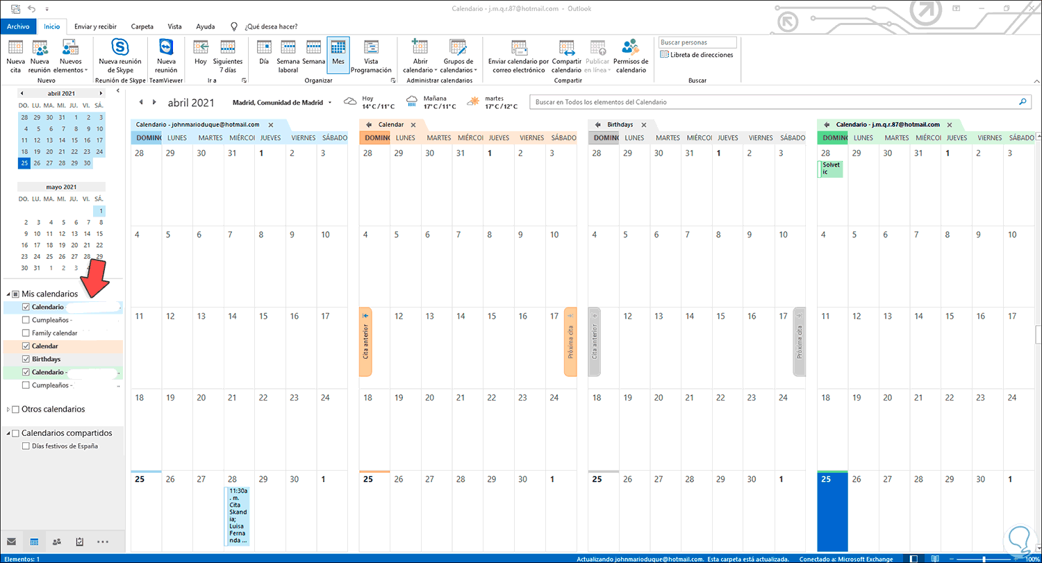 Al acceder a esta vista, en la esquina superior derecha es posible activar las casillas de los calendarios a desplegar a través de la opción Mis calendarios, basta con dar clic con el fin de seleccionar las casillas de verificación de los calendarios a visualizar en Outlook: