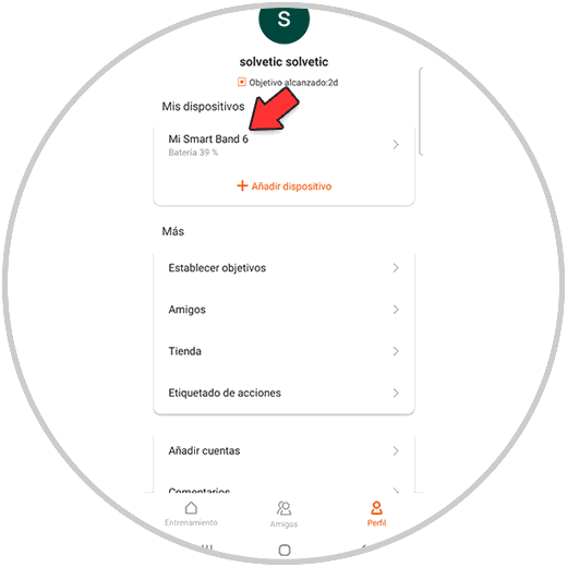 Ahora tienes que entrar en la app de mi fit y pulsar sobre "Mi perfil" y el modelo de tu pulsera en la parte superior.