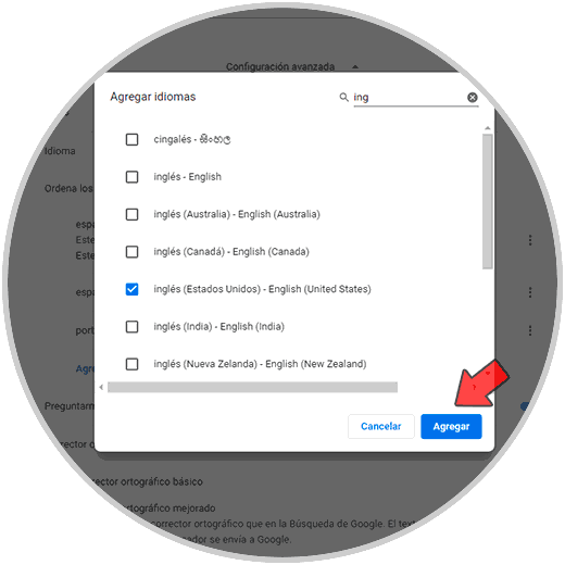 Una vez seleccionado damos clic en "Agregar" para ver el idioma disponible: