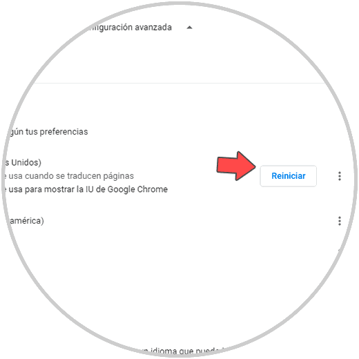 Reinicia Google Chrome dando clic en Reiniciar para ver los cambios respecto al idioma definido: