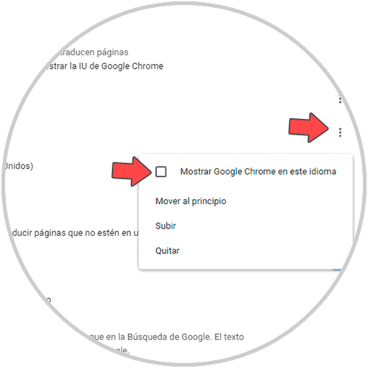 Para establecer el nuevo idioma en Google Chrome, damos clic en el menú contextual del idioma a establecer y seleccionamos "Mostrar Google Chrome en este idioma":