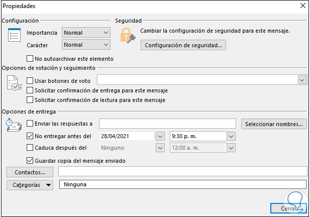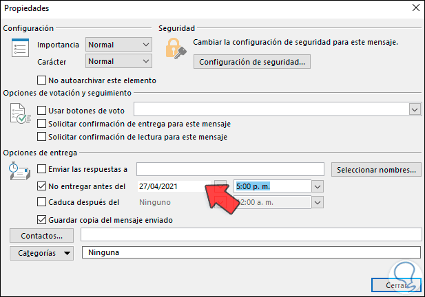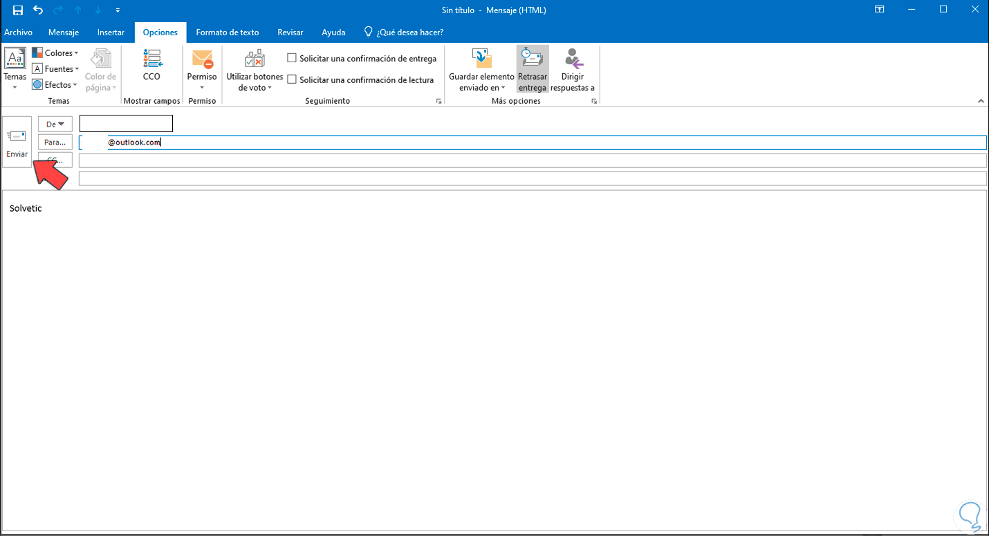 En la sección Opciones de entrega activamos la casilla "No entregar antes del" y seleccionamos la fecha y hora para enviar el correo electrónico en Outlook 2019: