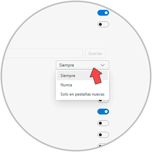 Seleccionamos la opción adecuada en la barra lateral, las opciones disponibles son. Esto afectará inmediatamente la barra de favoritos en Edge.